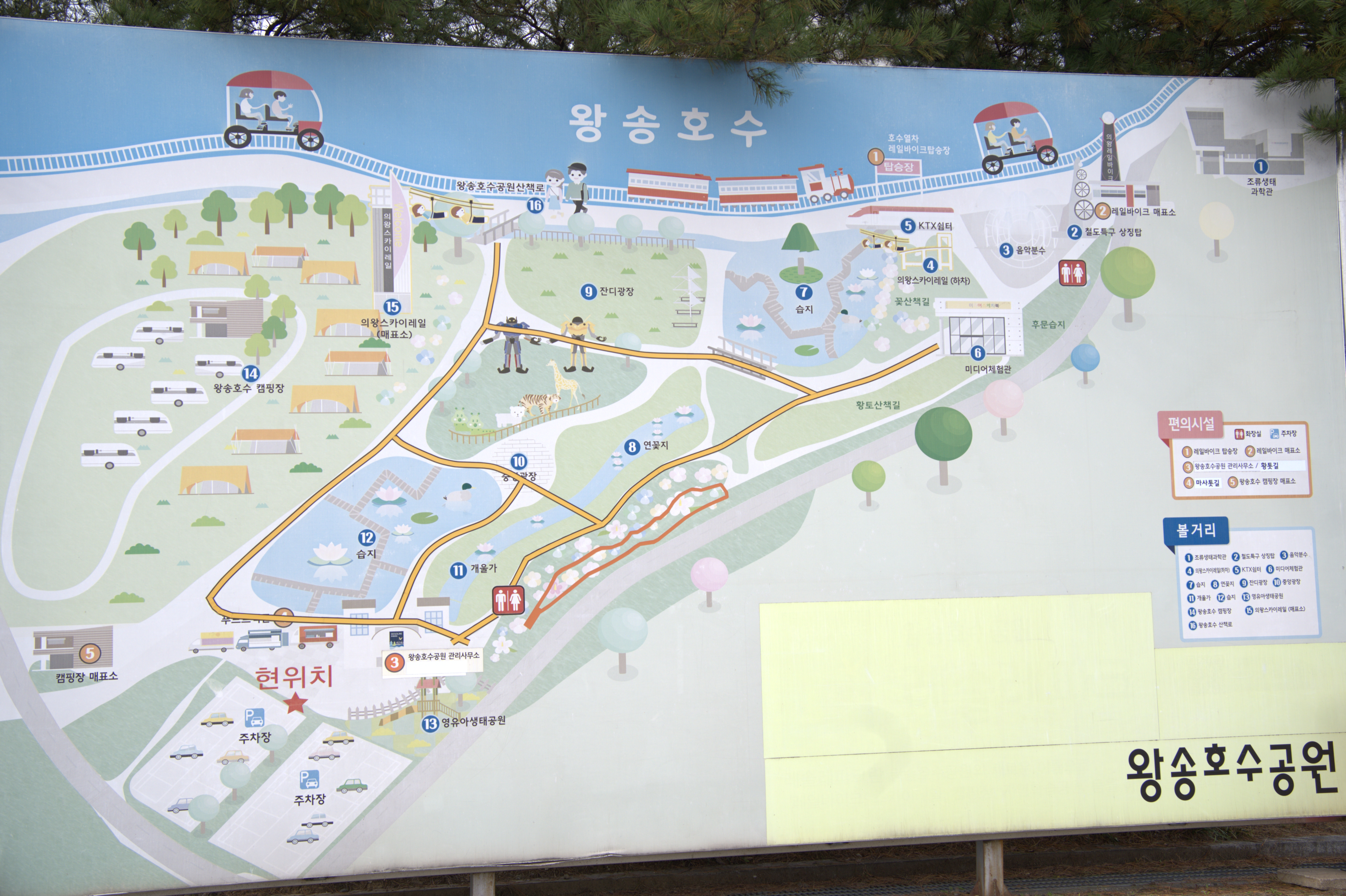 왕송호수공원 주차장 부터 제일 크게 외곽으로 돌았을때 두시간 정도 소요되었다.