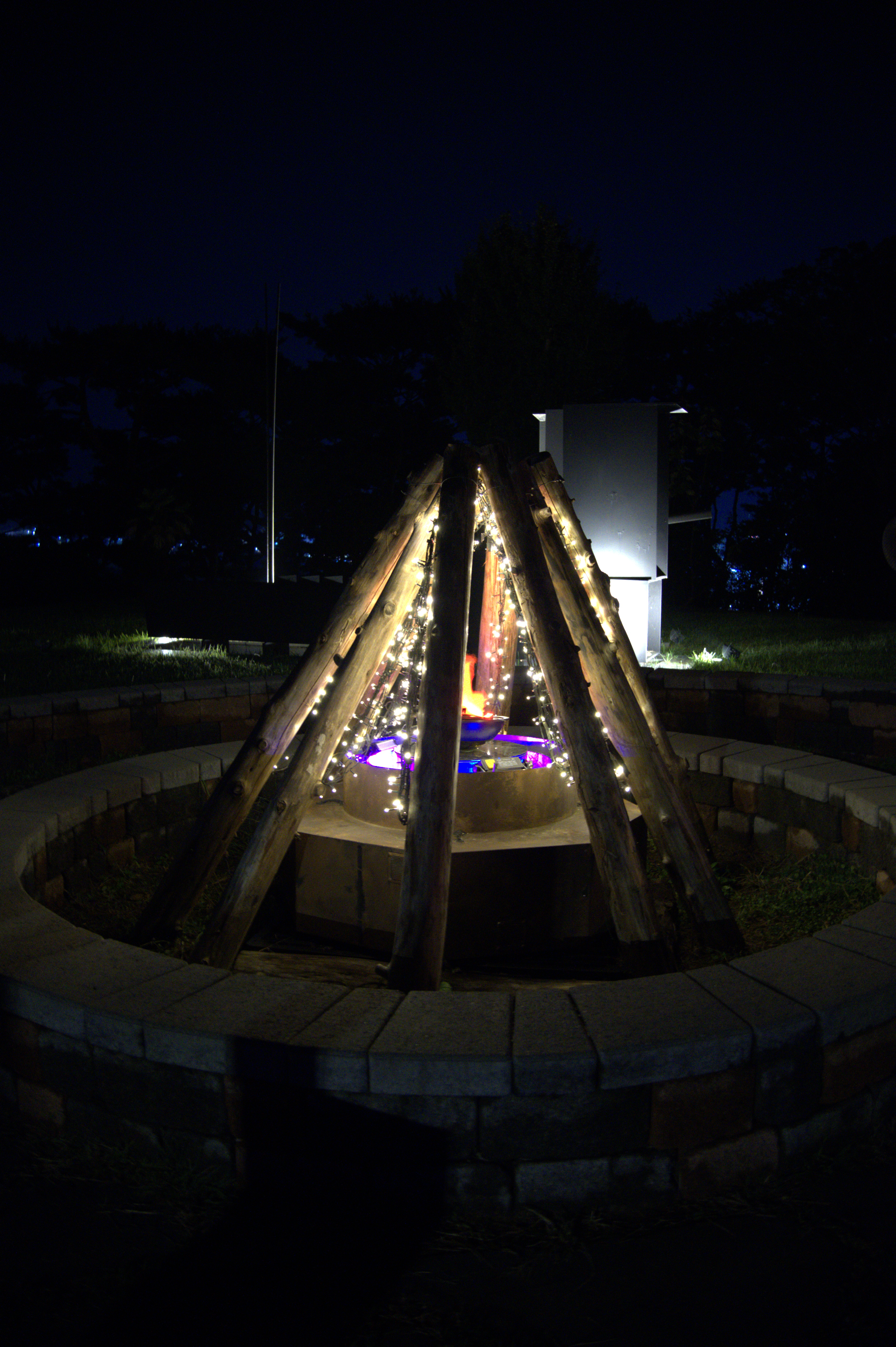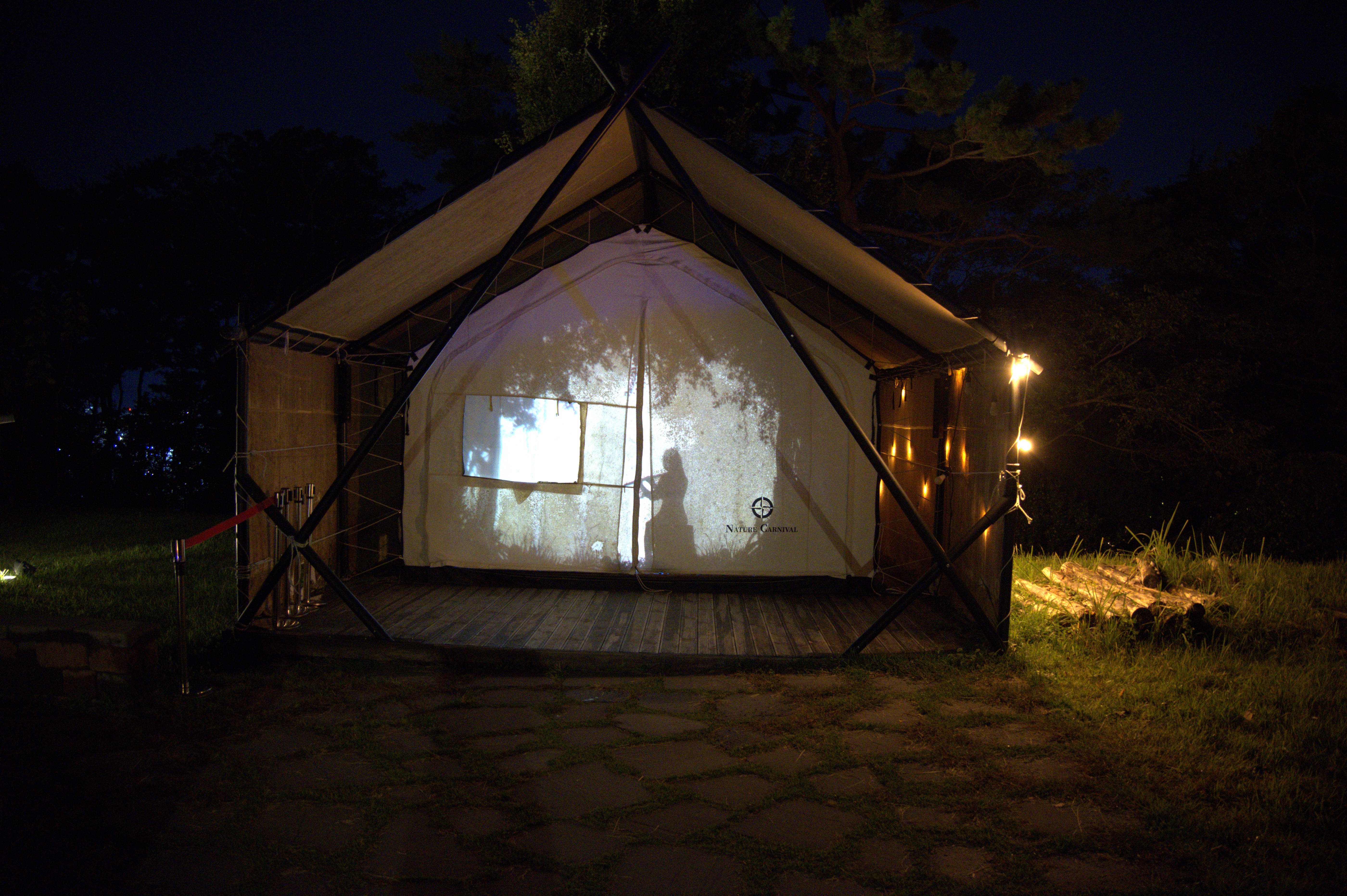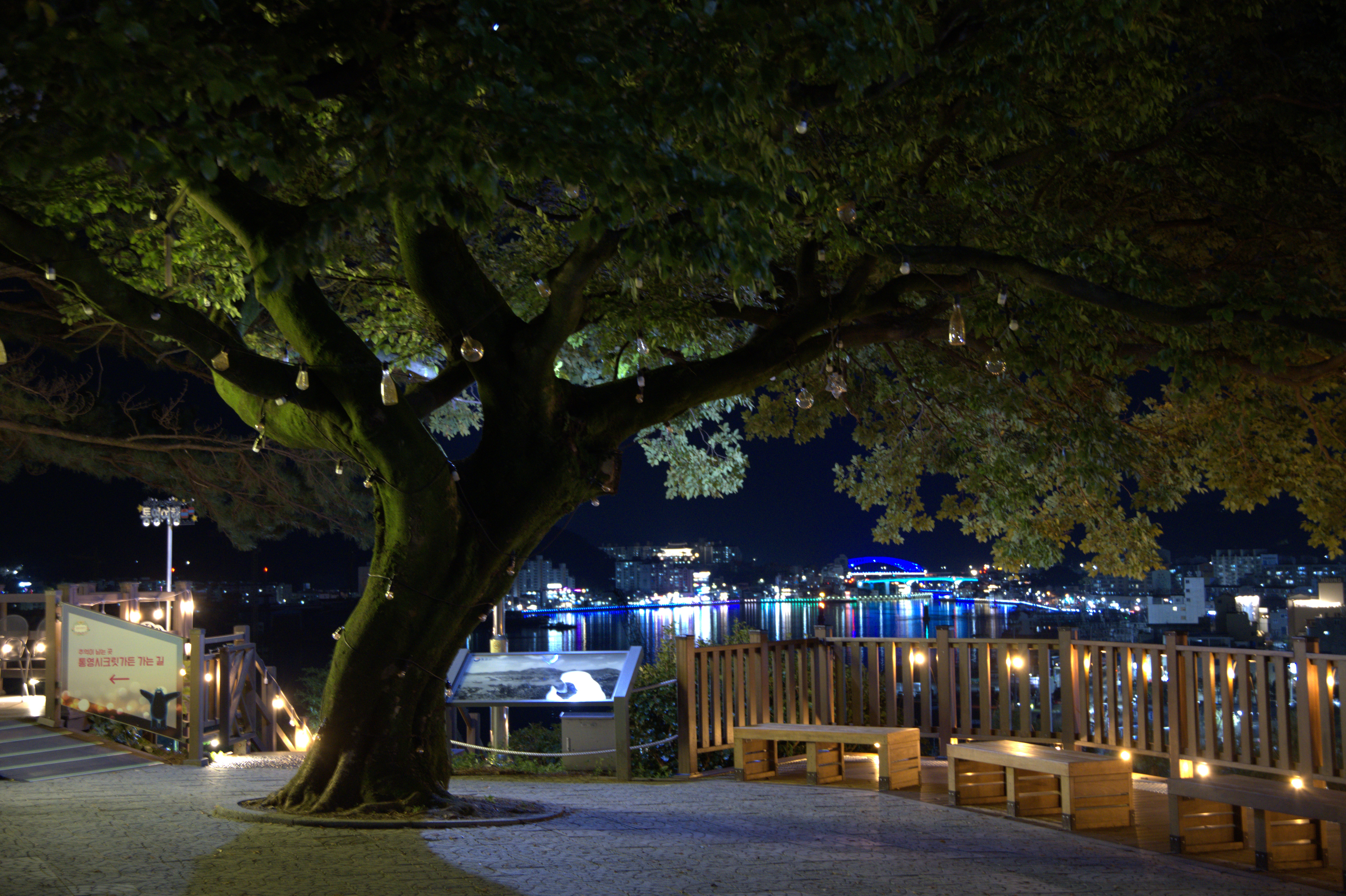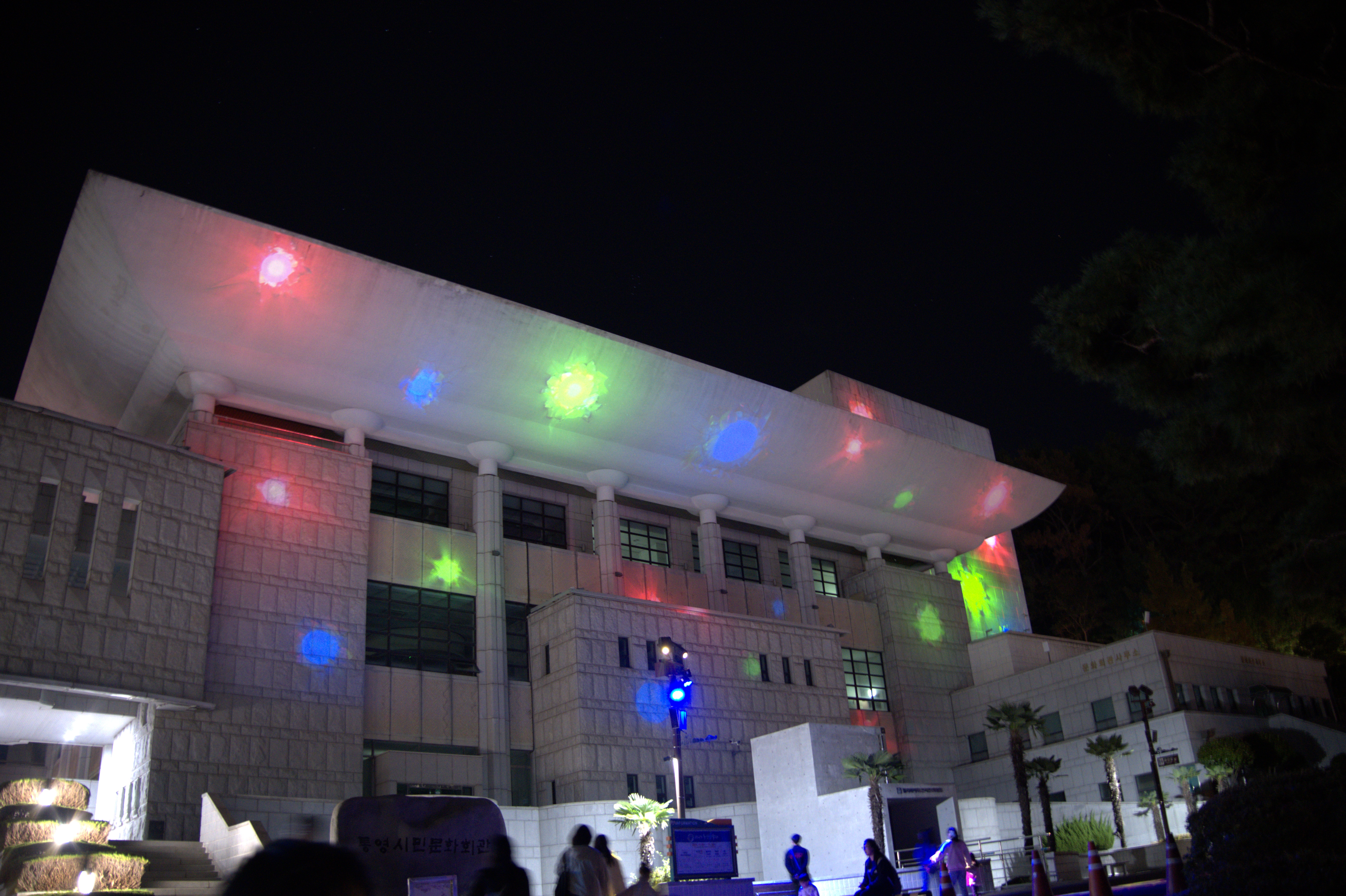 디피랑 매표소 앞에 통영시민 문화회관이 있고, 문화회관 건물에 조명을 쏴서 이쁜 그림을 만들어내었고, 나무와 데크 조명들이 너무나도 이쁜 모습을 보여줬다.