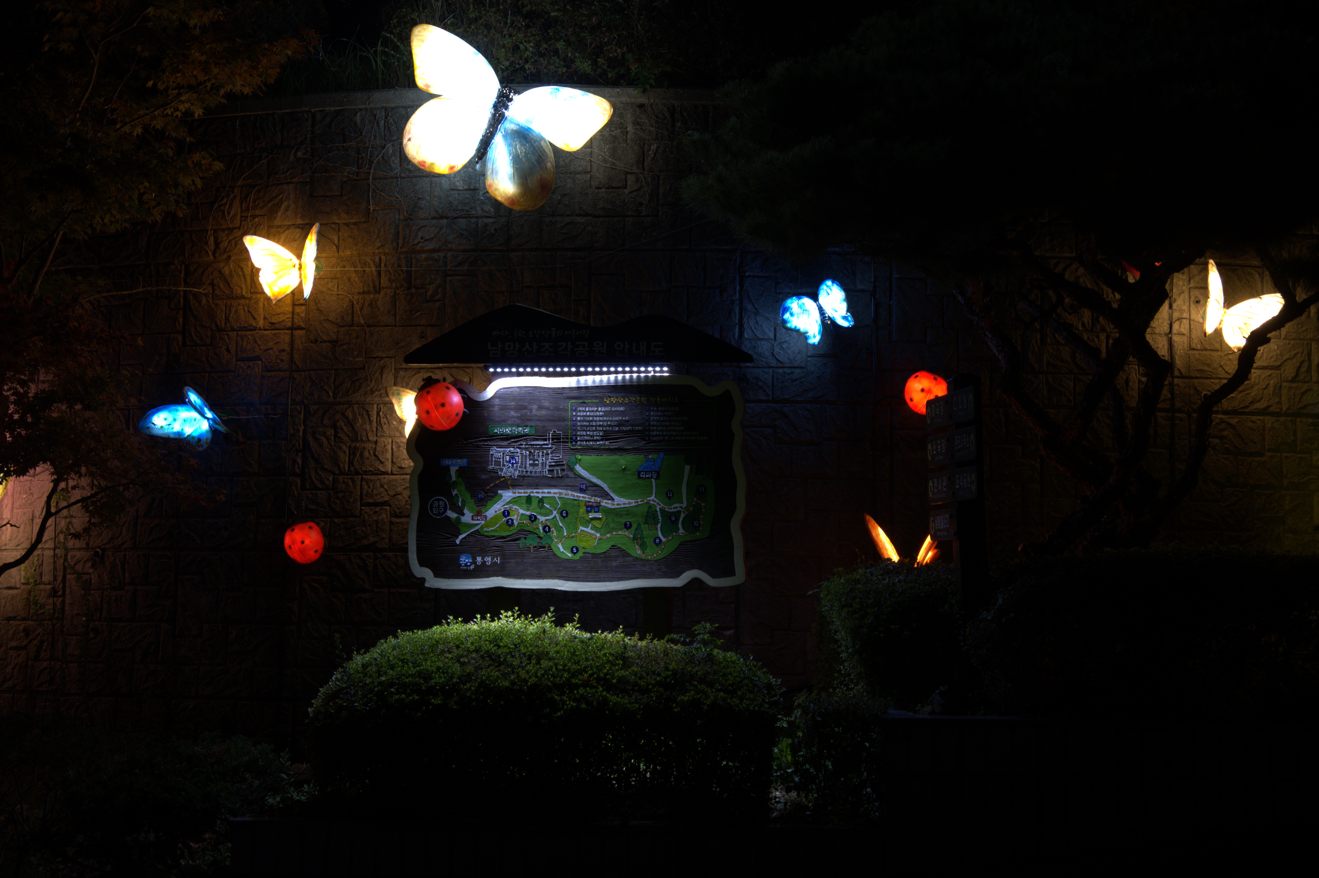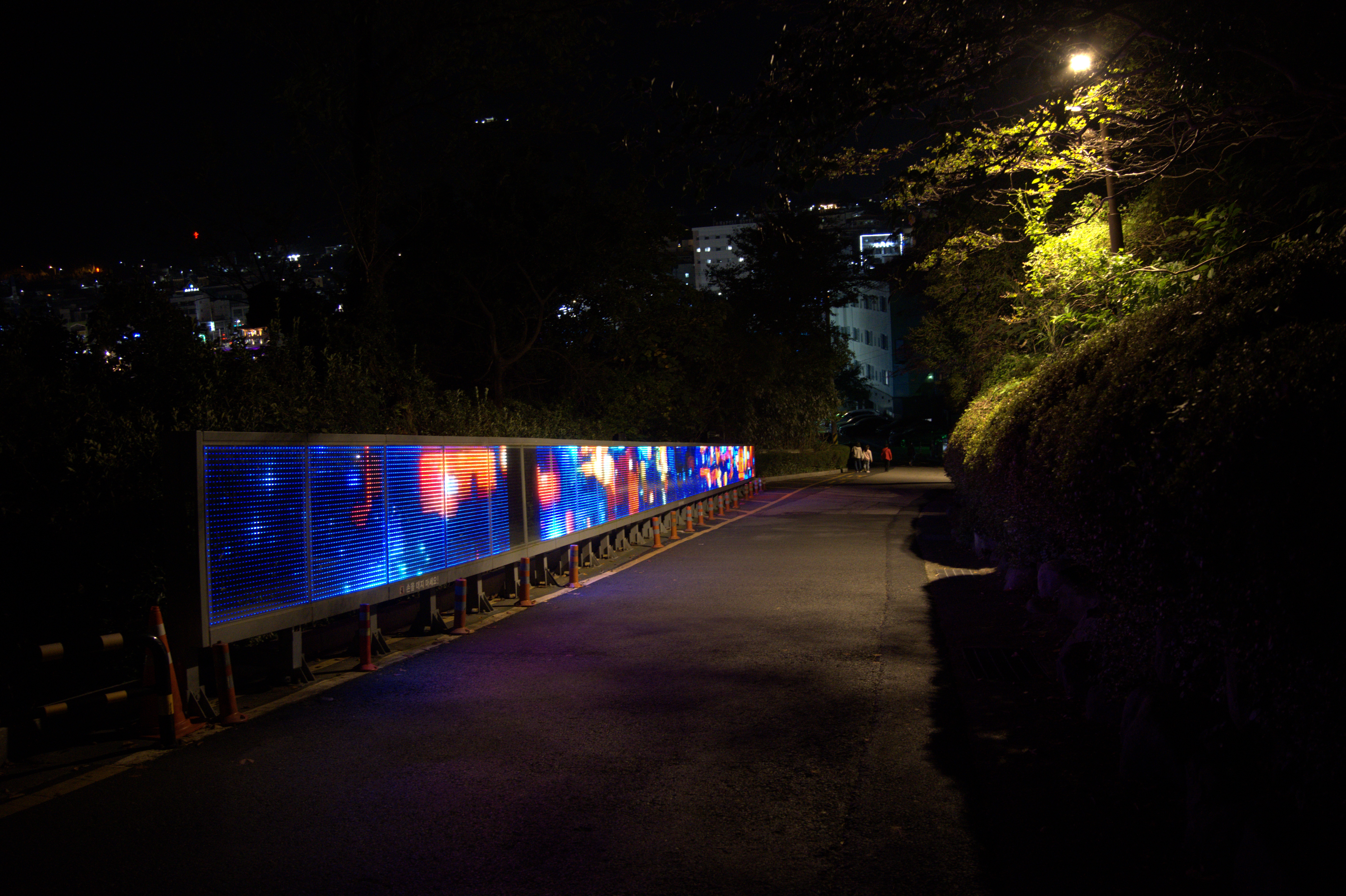 동피랑에 올라가는 길에는 밝게 빛나는 조명으로 길이라는 것을 알려준다.디피랑인 이곳은 낮에는 남망산 조각 공원으로서 관람이 가능하다고 한다. 너무 먼 곳이라 다시 오기 힘들겠지만 낮에 와도 또 다른 느낌으로 방문할 수 있을 것 같다.